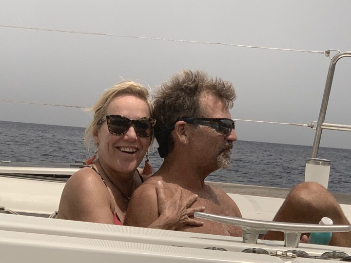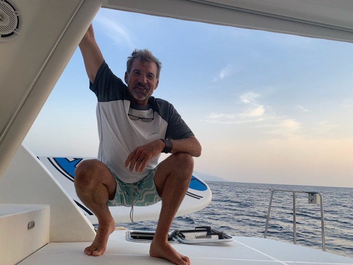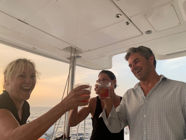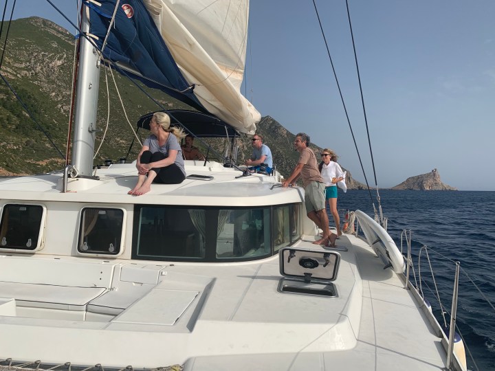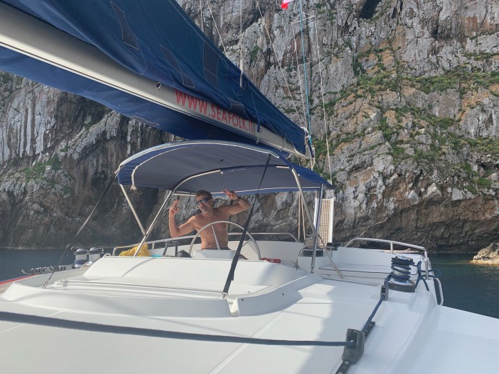 We made it to our wedding venue – our catamaran anchored in the bay.